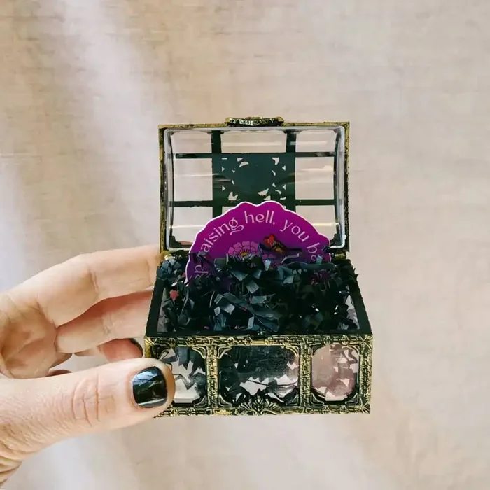 World‘s Tiniest Gift Box – 4 Item Feminist Treasure Chest Enamel Pin Keychain Gift Basket for Her in Pirate Fantasy Themed Gift Box