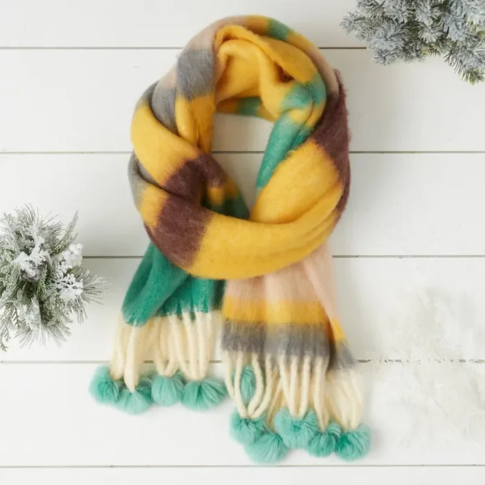 Zoey Stripe Scarf Green Twisted Fringe Pom Wrap 74″ x 15″