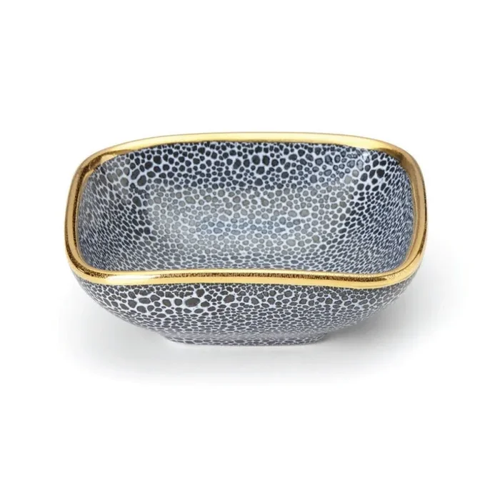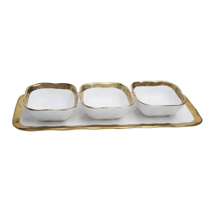 White Porcelain Condiment Dish – 3 Square Bowls with Gold Trim