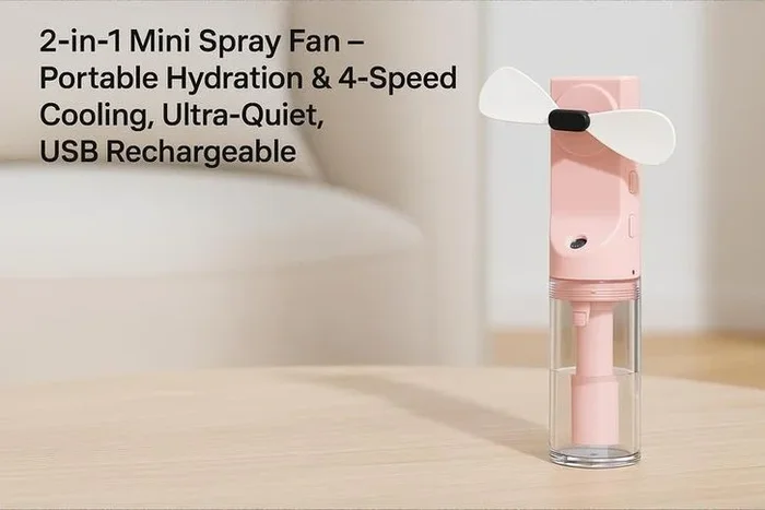 2-in-1 Mini Spray Fan with Nano Mist – 4-Speed, Ultra-Quiet, Portable USB Rechargeable