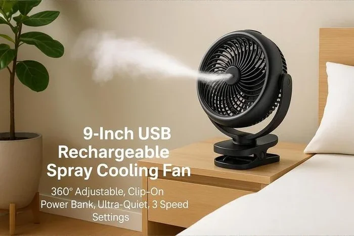 9-Inch Rechargeable Clip-On Fan with 3-Speed Settings, Spray Cooling & Power Bank – 360° Adjustable, Ultra-Quiet, USB Powered
