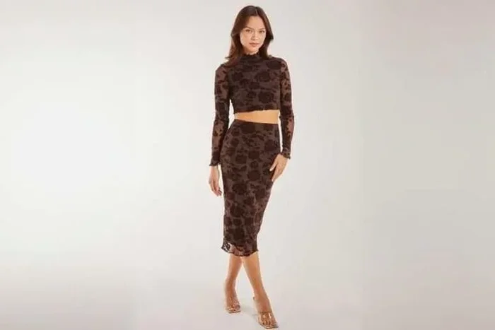 Flocked Floral Midi Skirt – Vintage 90s Style, Stretch Fit, Polyester Blend
