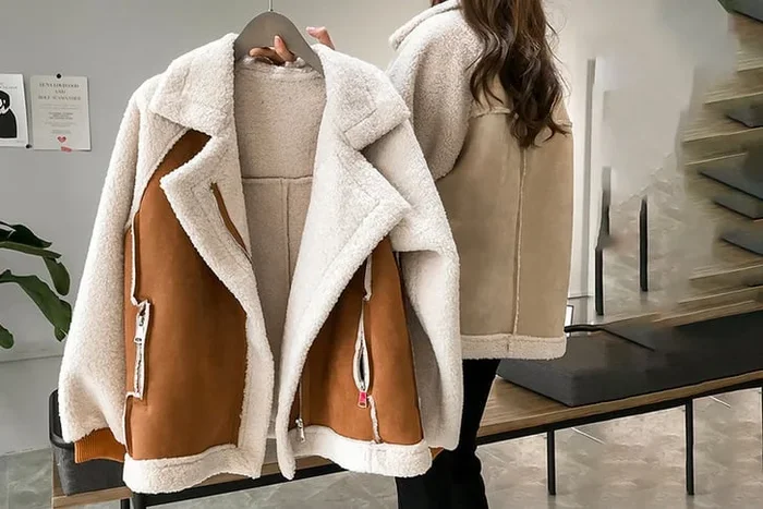Women’s Sherpa-Lined Aviator Coat – Cozy in Khaki or Apricot