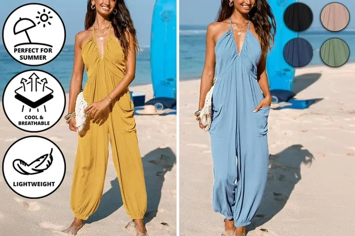 Women’s Sleeveless Pleated Halter Romper – Stretch Jersey, Chic Halterneck, Sizes S-2XL