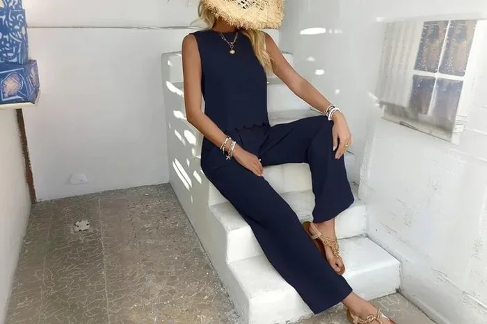 Women’s Summer Two Piece Co-Ord Set – 100% Polyester, Breathable, Sleeveless Crop Top & Wide Leg Trousers, Sizes 8–16