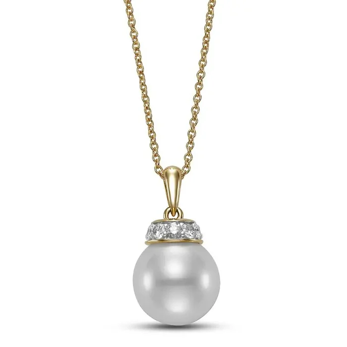 Necklace set with an 11mm pearl accented with a top diamond halo 14kt yellow gold-mastoloni