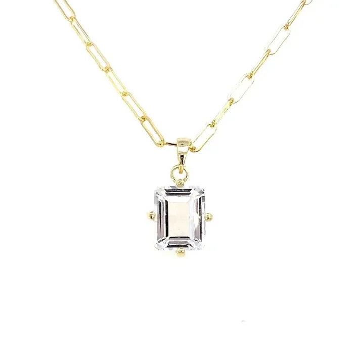 Necklace set with an emerald cut quartz stone on a paperclip chain 14kt yellow gold