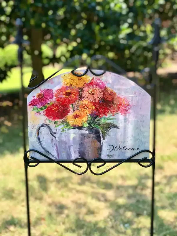 Zinnias in Pewter Pitcher Welcome Garden Sign