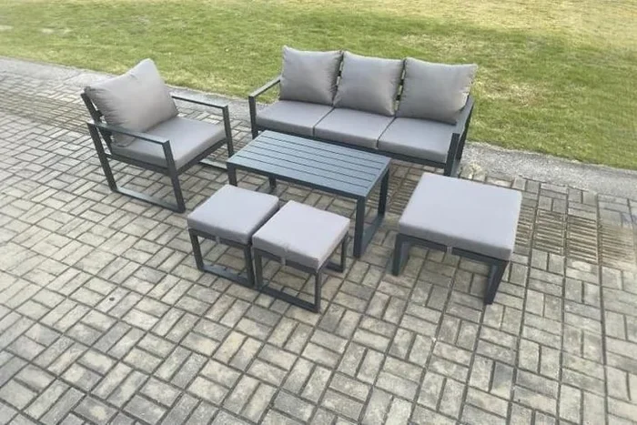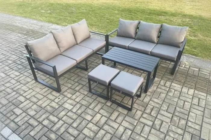 Aluminium Garden Sofa Set – 6-Seater Modern Outdoor Lounge with Coffee Table & Footstools