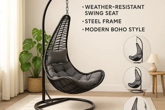 Black PE Rattan Hanging Egg Chair – Weather-Resistant Swing Seat, Steel Frame, Modern Boho Style
