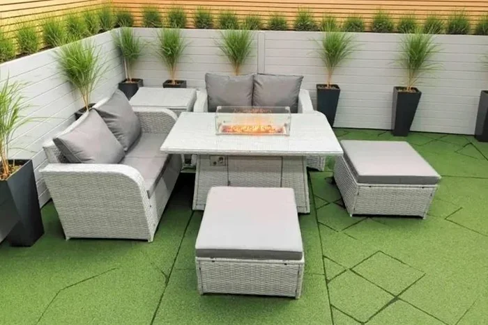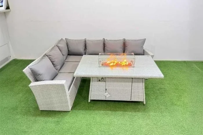 6-Seat Light Grey Rattan Corner Dining Set with Fire Pit Table – Weather-Resistant Modern Outdoor Lounge