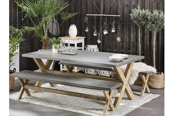 6-Seater Concrete Garden Dining Set with Benches – Weather-Resistant Fibre Cement & Acacia Wood, Modern Grey