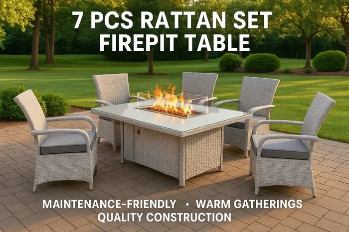 7 Piece PE Rattan Garden Dining Set with Firepit Table – Weather-Resistant Outdoor Furniture