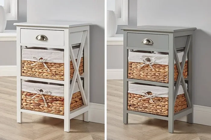 Wooden Storage Cabinet with Drawer & 2 Wicker Baskets – Modular Organiser, Pre-Assembled, Nautical Style (Grey or White)