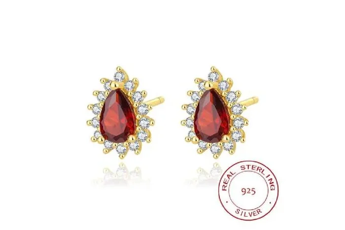 Sterling Silver Teardrop Stud Earrings – Garnet-Red Cubic Zirconia, 14K Gold Plated, Hypoallergenic