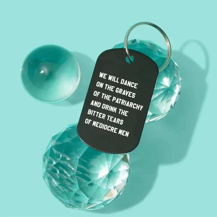 Dance on the Graves of the Patriarchy Dog Tag Keychain in Black, Laser Engraved