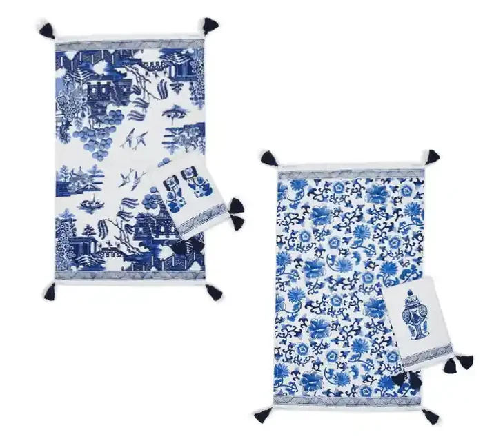 Chinoiserie Set of 2 Dish Towels with Tassels and Embroidery Accent