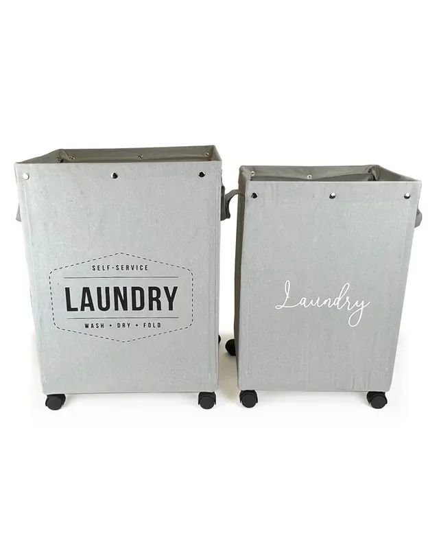 “Self-Service Laundry” Set of 2 Grey Rolling Laundry Hampers