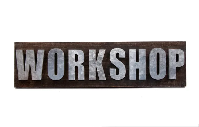 “Workshop” Dark Wood Wall Sign with Galvanized Metal Letters