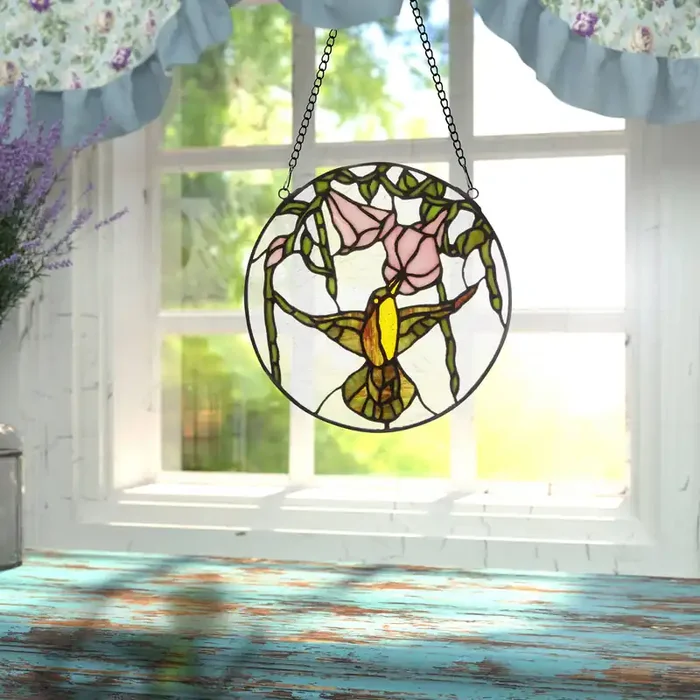 10″H Hummingbird and Hibiscus Stained Glass Window Panel