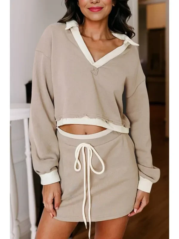 Colorblock Collared Cropped Pullover & Skirt Set