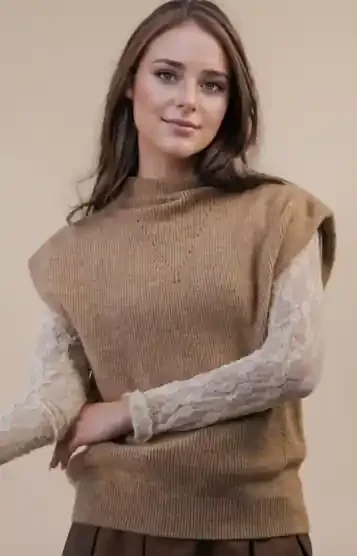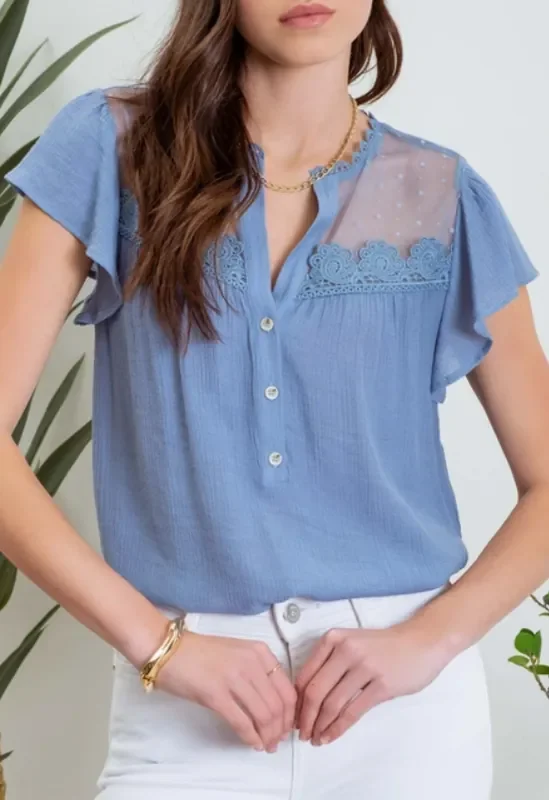 Split Neck Button Down Sheer Lace Yoke Blouse