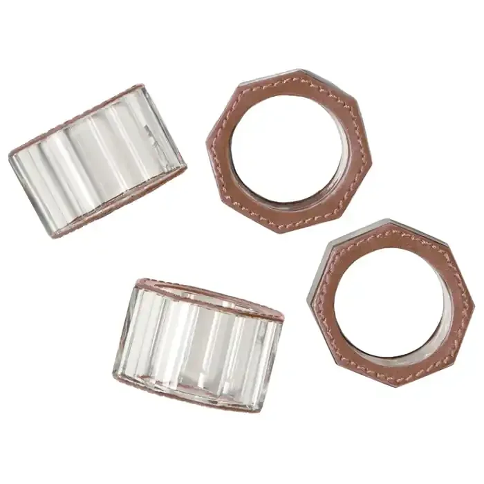 Arthur Tobacco Leather/Clear Glass Crystal Napkin Rings, Set/4