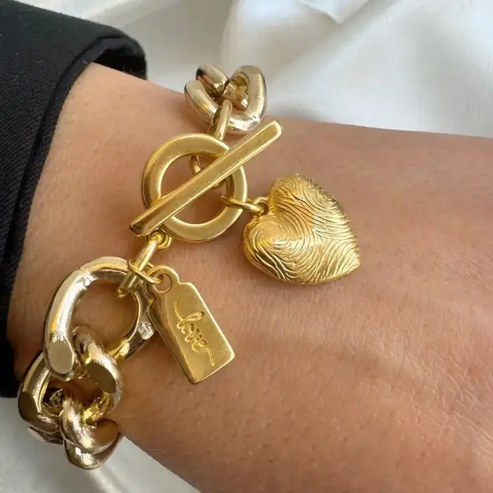 Etched Fingerprint Gold Chunky Chain Bracelet with Heart Charm Handmade in Athens, Greece