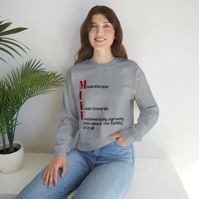 MILF Misanthrope I Lean Towards Fundamentally Agreeing With About the Futility of It All Unisex Heavy Blend™ Crewneck Sweatshirt Sizes SM-5XL Plus Size Available