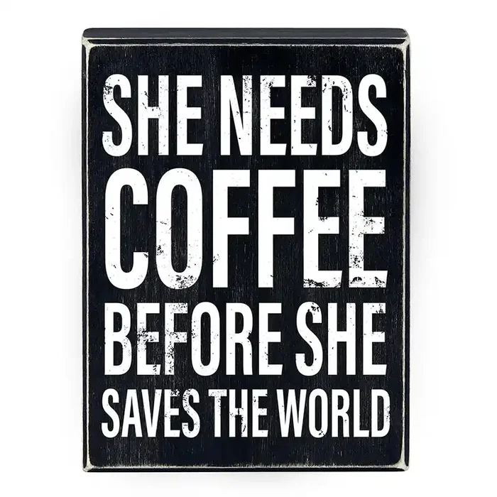 She Needs Coffee Before She Saves The World Wooden Decor Box Sign 6″ x 8″