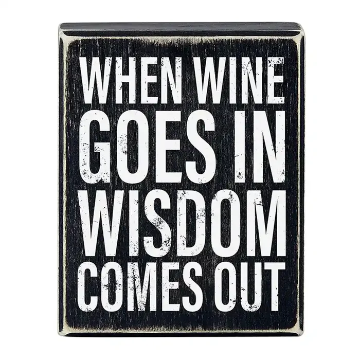 When Wine Goes In Wisdom Comes Out Box Sign Funny Wooden Black Home Office Decor 4″ x 5″