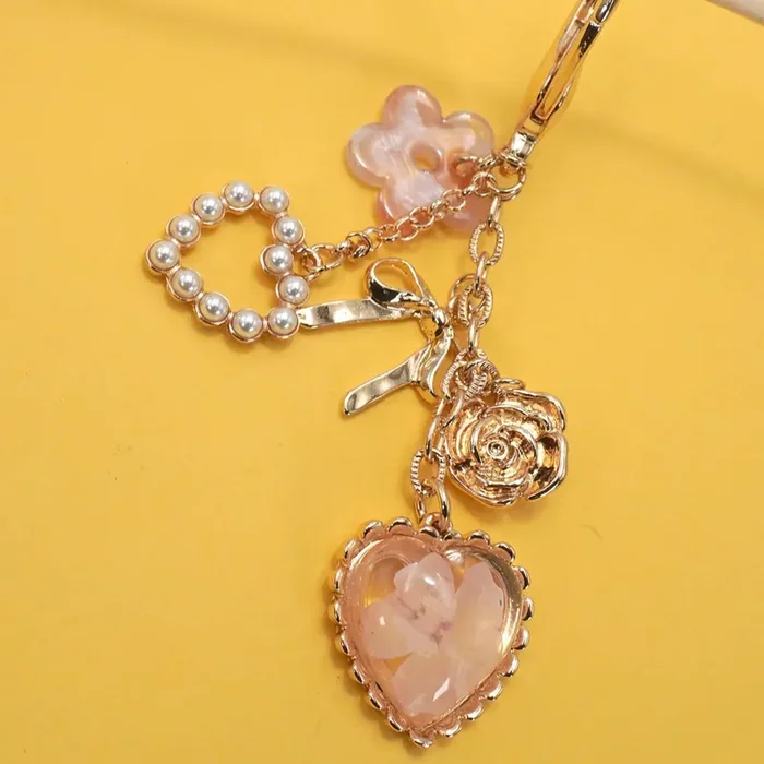 Pressed Flower Coquettecore Bow Pearl Heart Bag Charm in Gold Plating Keychain Tote Accessories