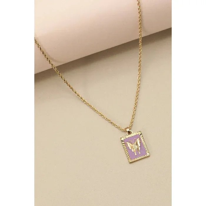 Rectangle Butterfly Epoxy Pendant Necklace Gold Tone Chain Fashion Jewelry