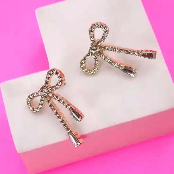 Rhinestone Coquette Bow Drop Earring in Gold Plating 1″ Long