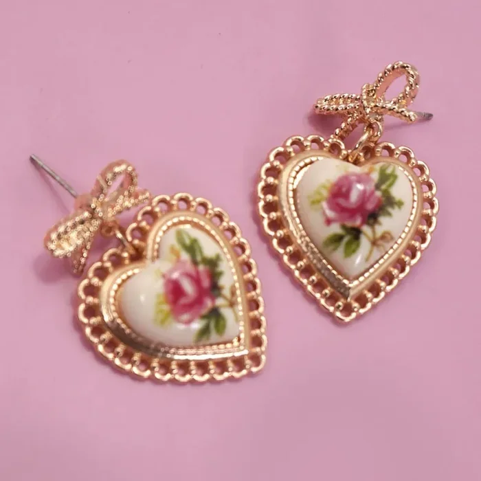 Rose Ceramic Porcelain Coquette Bow Drop Earrings in Gold Plating 1.25″ Long