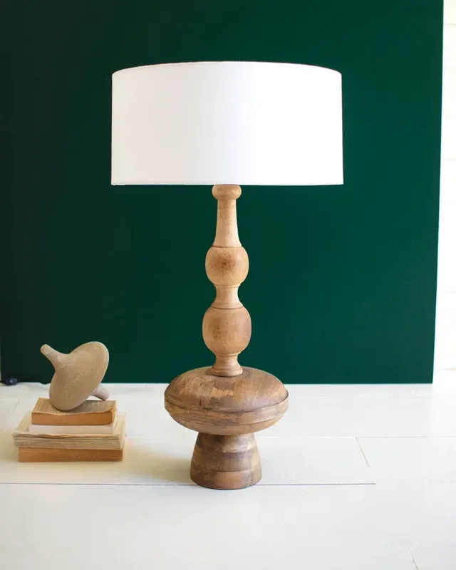 Carved Wooden Table Lamp With Off-White Barrel Shade