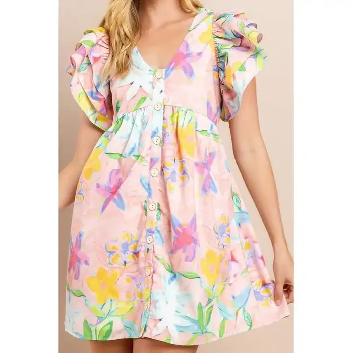 Floral Printed Dress in Blush V Neckline Button Down Mini Dress