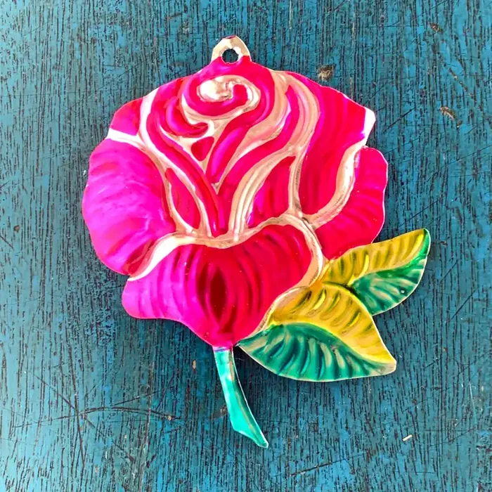 Tin Rose Ornament Hand Painted in Mexico Metal Flower Hanging Decor