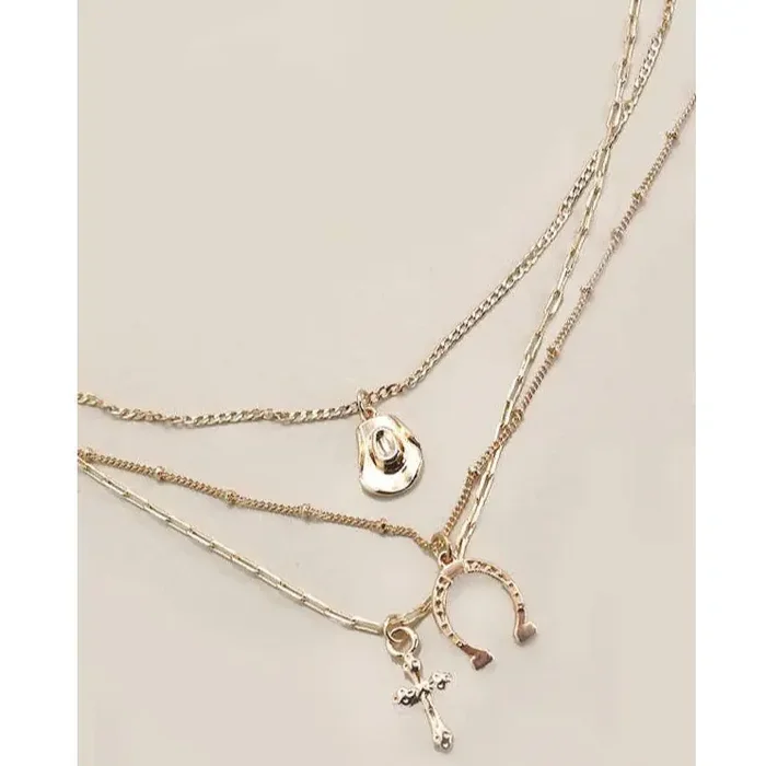 This triple-chain featuring curb, rope and figaro chain. It lays effortlessly around the neck.