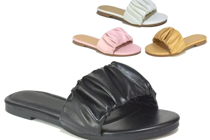 Flat heel and round toe for cushioned support.