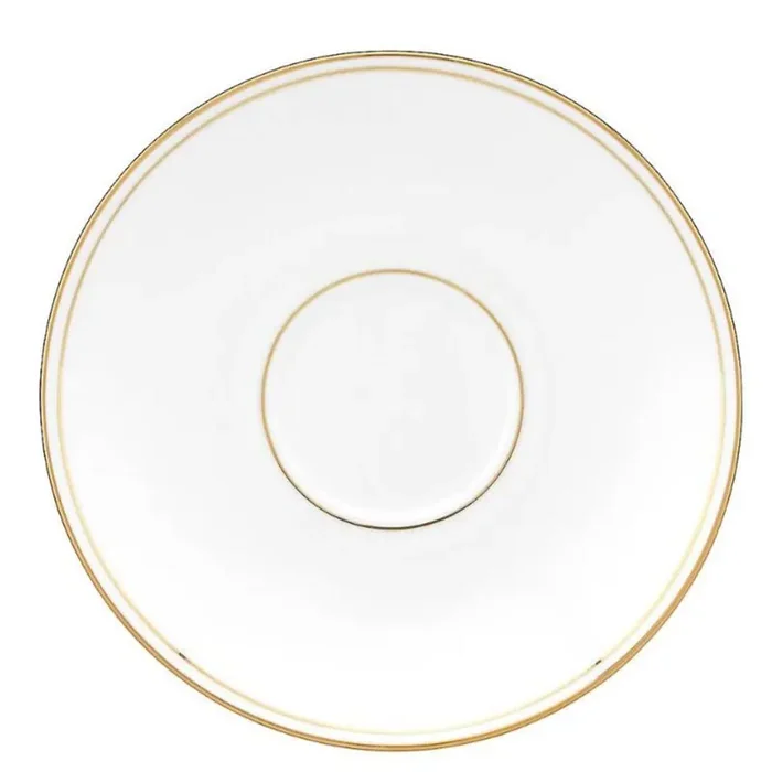 The Lenox Federal 5-Piece Gold Place Setting is crafted from durable porcelain and adorned with glittering 24-karat gold accents along the rim, making it a graceful complement to any table setting.