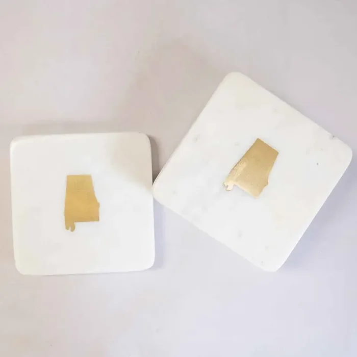 If you’re serving up cocktails or champagne, make sure you have our gold marble coaster set. The set comes with four marble coasters. The coasters have a white marble center with silver foiled raw edges. The set comes tied together, making it easy for gifting.