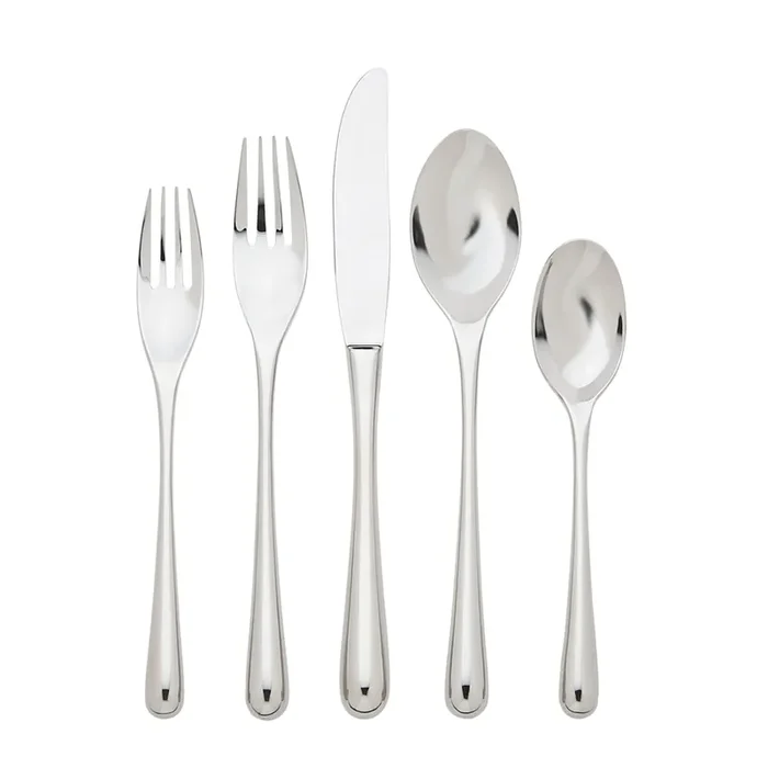 Set includes 1 table fork, 1 table knife, 1 dessert fork, 1 dessert spoon, and 1 coffee spoon.