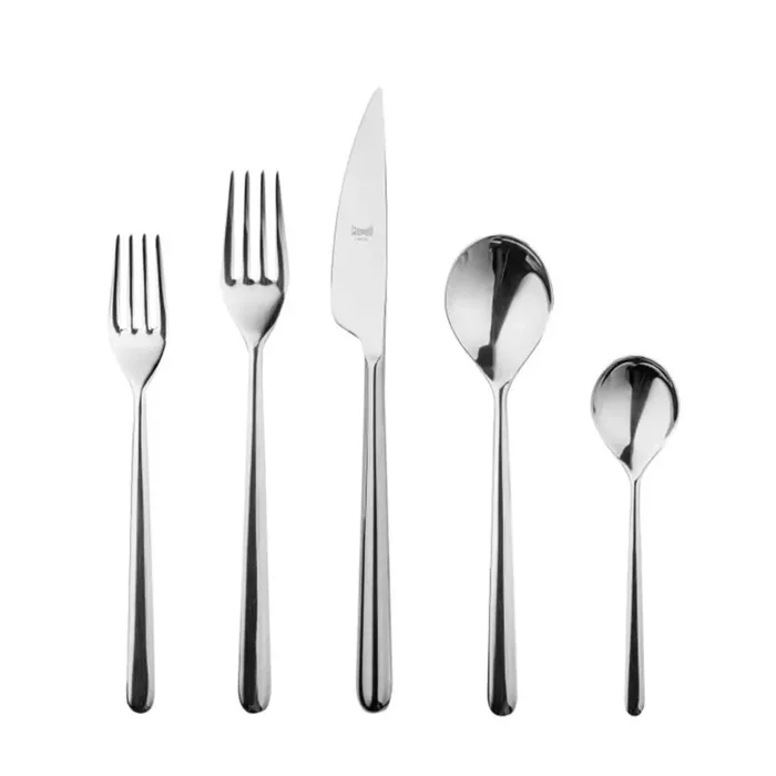 Set includes 1 table fork, 1 table knife, 1 dessert fork, 1 dessert spoon, and 1 coffee spoon.