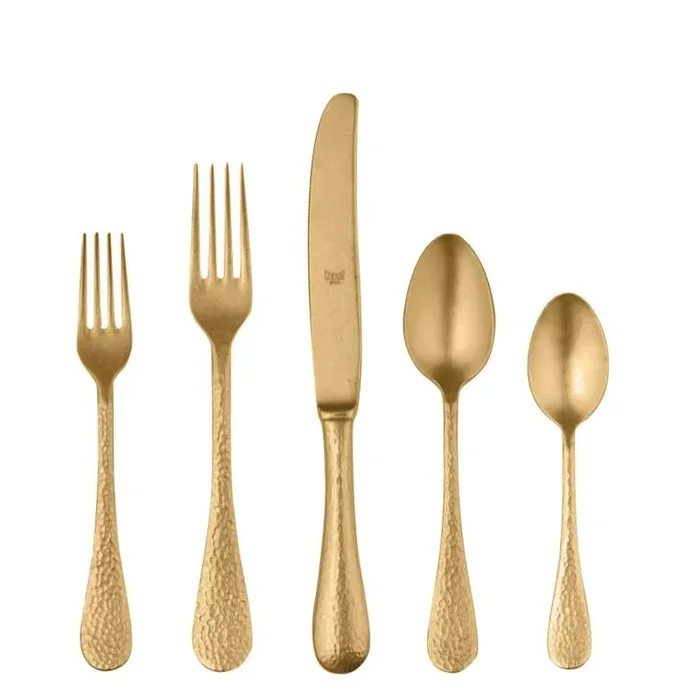 Set includes 1 table fork, 1 table knife, 1 dessert fork, 1 dessert spoon, and 1 coffee spoon.