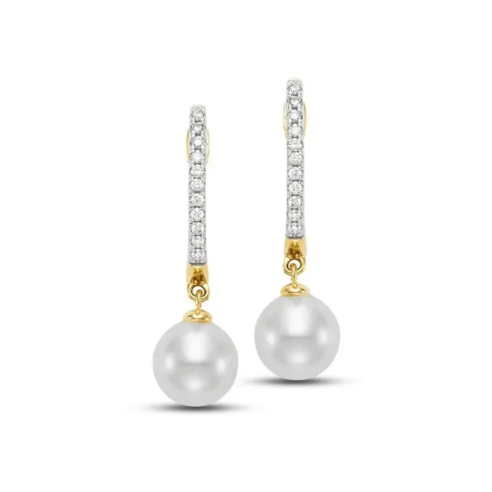 This pendant has a floating 8.5-9mm fresh water pearl; the chain is set with 6 small full cut diamonds in bezel stations having a total weight of 0.07ct.; the chain is 18″ in length