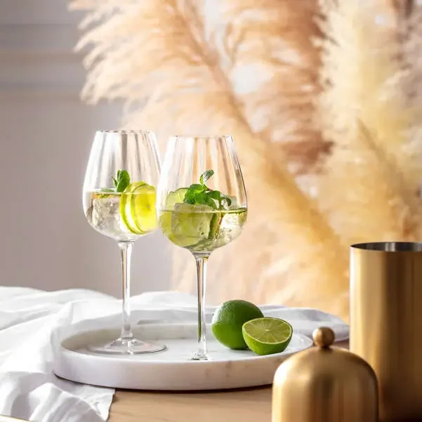 The Nude Glass Fantasy White Wine Glasses Tall, Set of 2, feature a sleek, sculptural silhouette elevated by a tall, refined stem. The subtle dimple at the bottom of the bowl serves as a signature detail, reflecting the recurring theme of the Fantasy collection. Crafted from clear, lead-free crystal, these glasses offer a timeless, sophisticated design that enhances the enjoyment of white wine while adding an artistic touch to any table setting. Dishwasher safe.