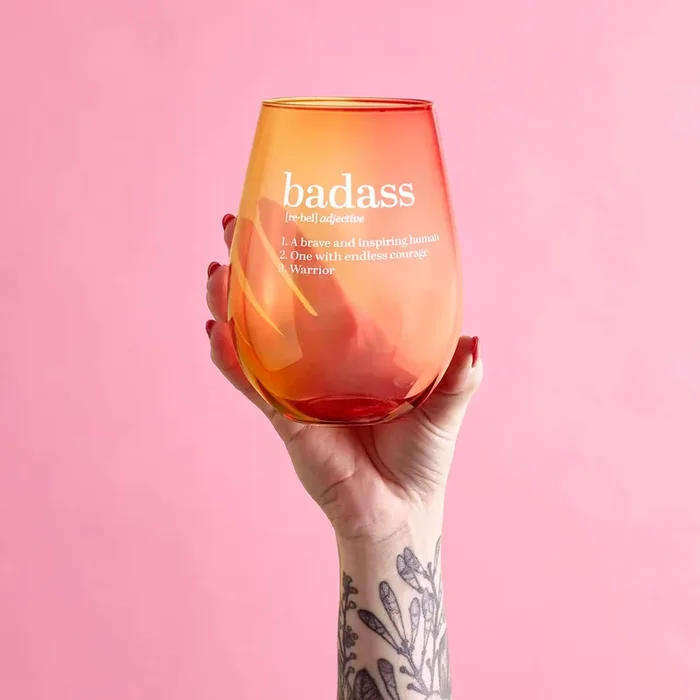 - Reads “Self Love Club”; gold lettering on pink tinted glass