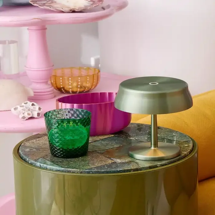 Zafferano Amelie Cordless Rechargeable Floor Lamp is a portable, rechargeable battery-operated floor lamp designed by Sara Moroni. This adaptable lamp comes with a silicone hook and cap, enabling a seamless transformation into a suspension lamp for direct ambient illumination. Featuring touch controls for on/off operation, dimming, and color temperature selection, Amelie offers versatile lighting solutions for any space. Indoor feature is for candlesticks and other non-electric lighting items.